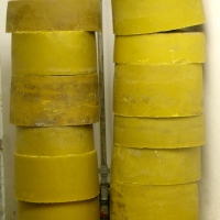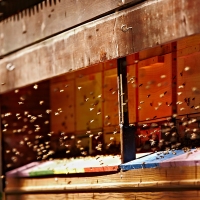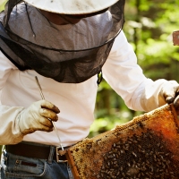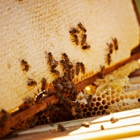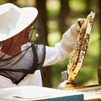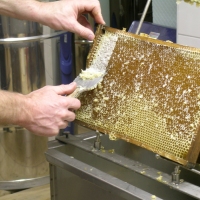 Honigernte und Verarbeitung.Überschüssiges Wachs und Propolis wird vom Rahmen geschabt. Die Deckel auf den Waben werden abgekratzt. Die Rahmen mit den Waben werden nach dem Entdeckeln in die Honigschleuder eingesetzt und bei niedriger Drehzahl ausgeschleudert.